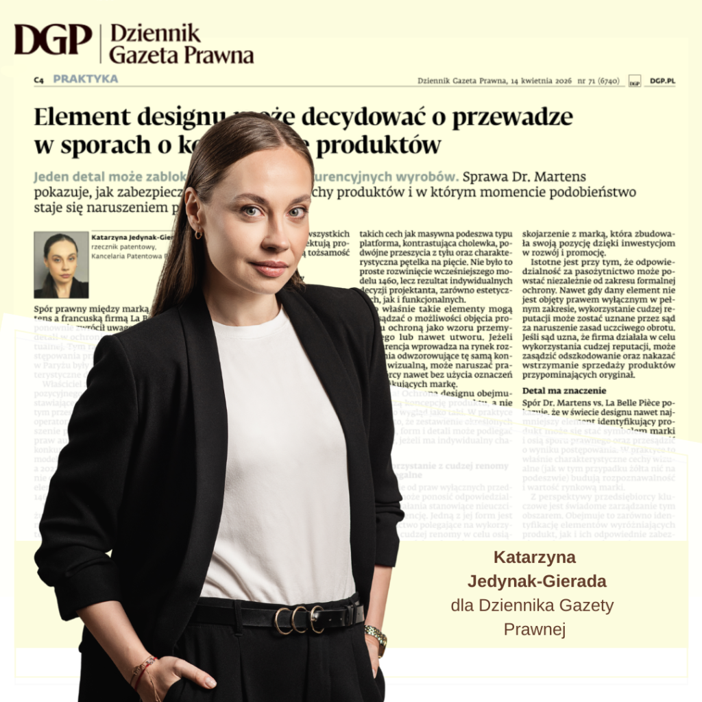 „Jeden element może zablokować sprzedaż konkurencyjnych wyrobów” – to punkt wyjścia publikacji, naszej rzeczniczki patentowej, Katarzyny Jedynak-Gierady, która ukazała się w Dzienniku Gazecie Prawnej.